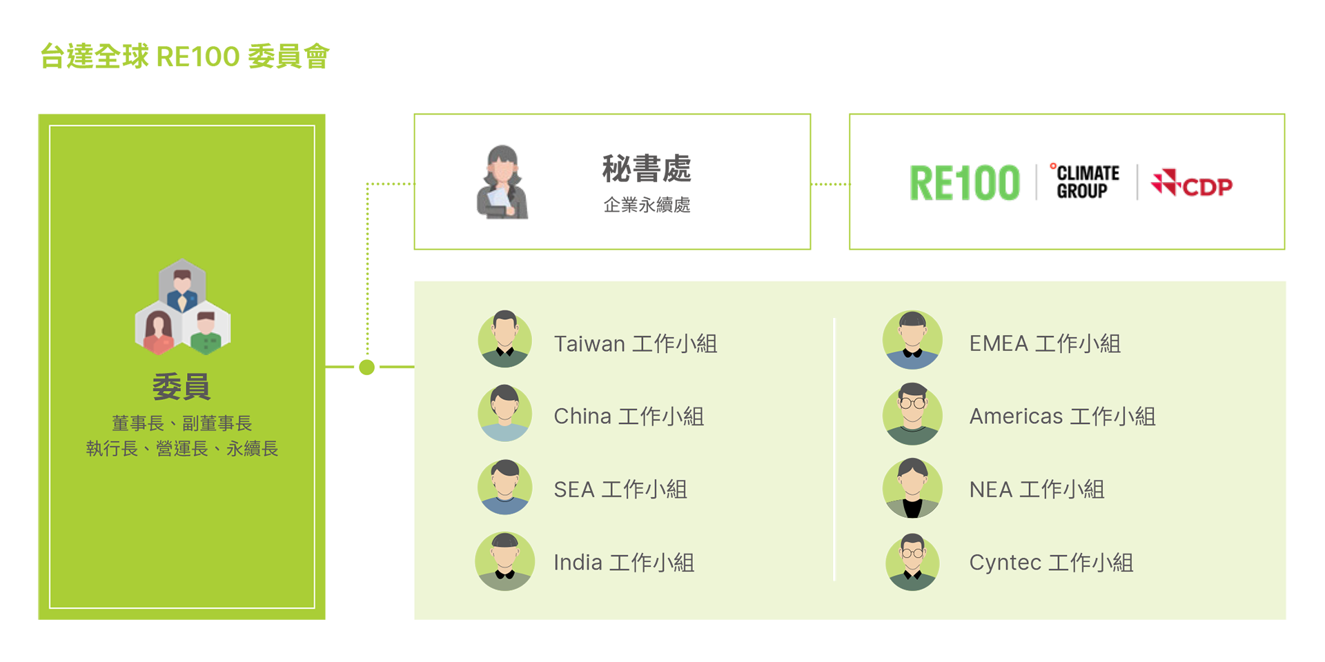 台達2021年宣布加入全球再生電力倡議組織RE100金級會員,承諾台達全球營運據點於2030年達成100%使用再生電力的目標,並於同年正式成立台達全球RE100 委員會,以董事長、副董事長、執行長、營運長及永續長為主要委員,下轄八個工作小組,擴及30幾個國家;每個工作小組由地區最高主管帶領,建立區域型的推動組織,管理擴及所有據點,負責各地區所有據點的再生電力目標推動及達成。