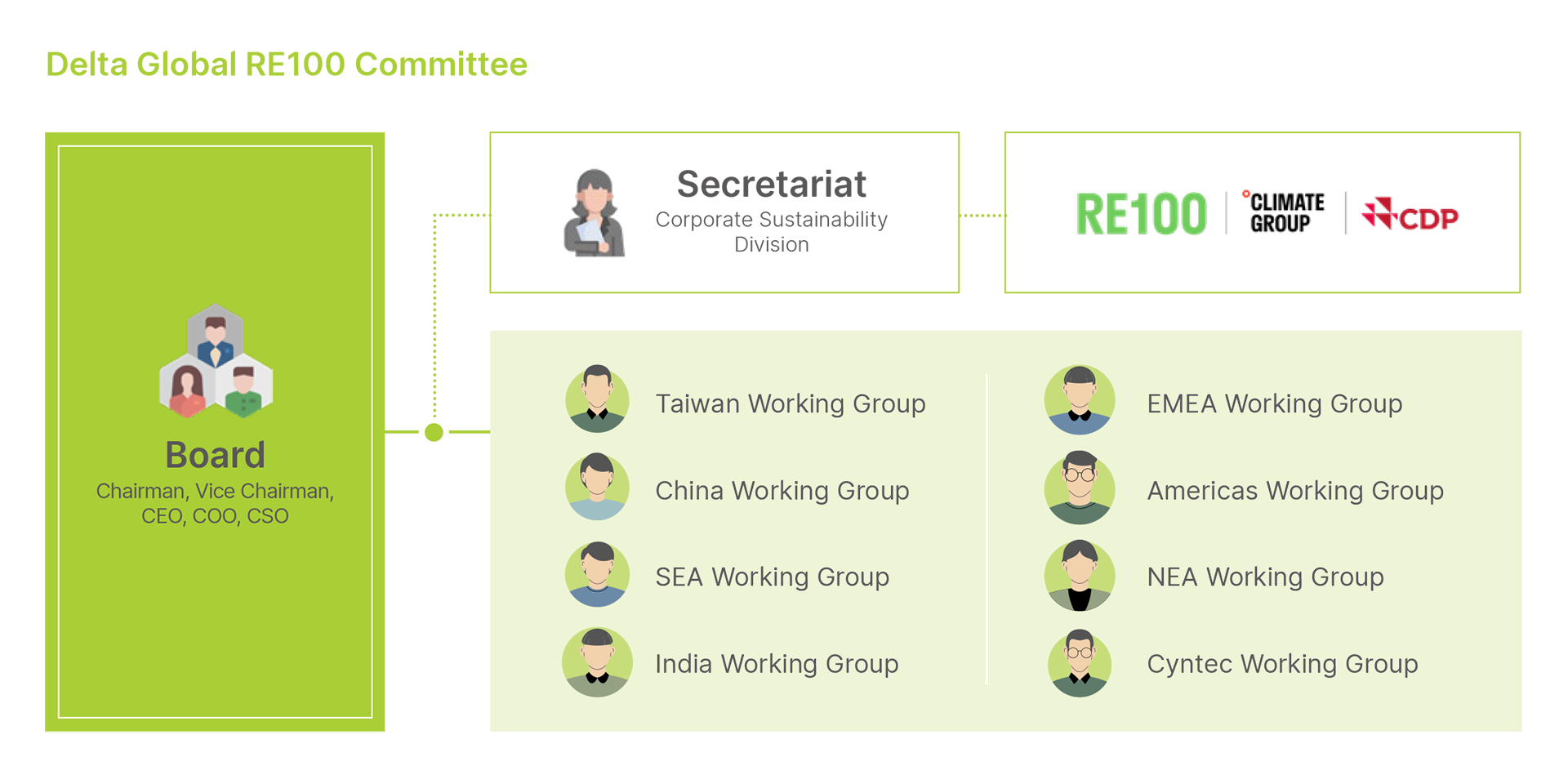 Delta announced in 2021 that it had joined the global renewable electricity initiative RE100 as a Gold Member, and pledged to achieve the goal of 100% renewable electricity by 2030 for Delta's global operation sites. Delta officially established the Delta Global RE100 Committee in 2021 with the Chairman, Vice Chairman, CEO, COO, and CSO as the main members who oversee 8 working groups in more than 30 countries. Each working group is led by the president of regional operations, who establishes a regional promotion organization to expand management to all sites. The organization is responsible for the promotion and attainment of renewable electricity targets for all sites in each region.