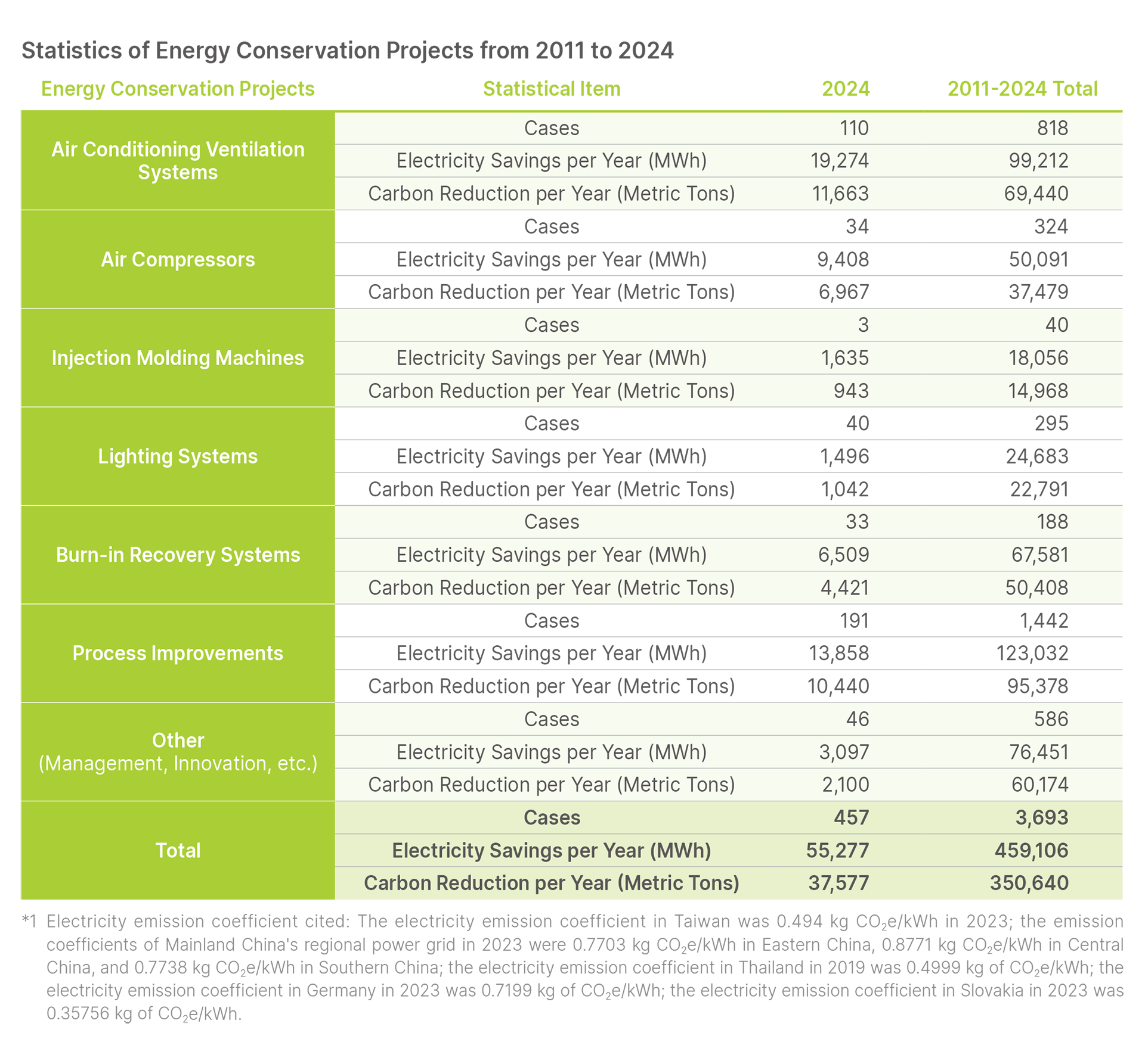 From 2011 to 2024, Delta's global operation sites have continued to implement energy conservation and carbon reduction measures. The Company put 457 energy conservation projects into practice in 2024 and saved approximately 55,277 thousand kWh of electricity, equivalent to approximately 37,577 metric tons CO2e. Delta implemented a total of 3,693 energy conservation projects from 2011 to 2024 with an estimated 459,106 thousand kWh of electricity saved, equivalent to a reduction of 350,640 metric tons CO2e.